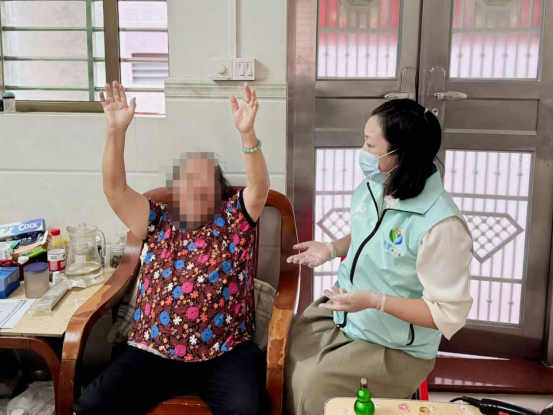 工作人员协助罗伯进行肢体锻炼 通过社区的宣传,英姨申请了居家养老服务。东城居家养老服务中心为英姨定制了每周两次、每次两小时的喘息服务。每逢周一、周四的早上,是英姨的“脱岗”时间,护工阿连都会准时上门服务。在这两个小时里,她不仅为罗伯提供专业护理,还会进行康复训练、居家清洁和情感交流。 “伯伯,我们现在先冲凉好不好?”阿连一边轻声询问,一边利落地准备好洗浴物品。洗浴完后,她熟练地为罗伯测量血压、进行肌肉按摩和肢体训练,保持肌肉功能。护理好罗伯之后,阿连开始井井有条地为他整理床铺、洗晾衣物和打扫居室;天气好的时候,还会推着轮椅带罗伯去花园晒太阳、聊聊天。 “自从有阿连来服务,我可以透啖气了。阿连服务专业有经验、对老人有耐心,帮他理发、换床铺、冲凉,甚至推他出去散心;我腰不好,这些事都做不来,我很放心交给她。”每周4小时的支援,给了英姨喘息的空间,减轻了她的照护压力。