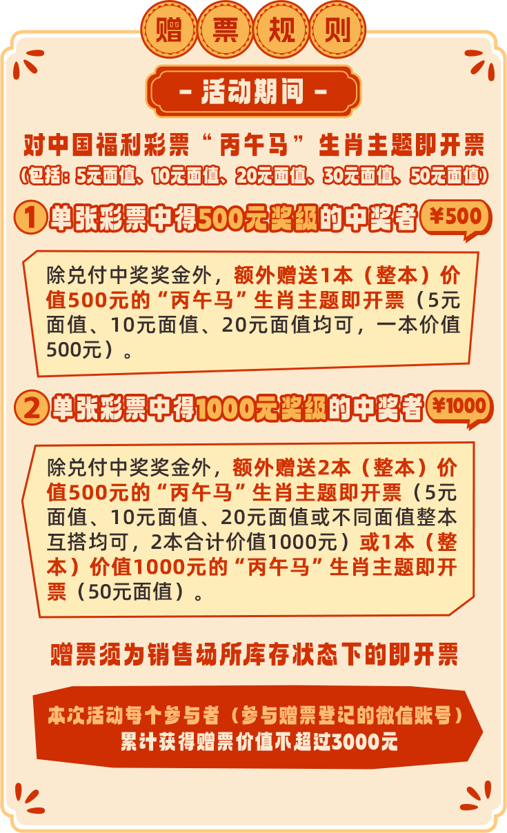活动期间,对中国福利彩票“丙午马”生肖主题即开票单张彩票中得500元奖级的中奖者,除兑付中奖奖金外,额外赠送1本(整本)价值500元的“丙午马”生肖主题即开票(5元面值、10元面值、20元面值均可,一本价值500元);对中国福利彩票“丙午马”生肖主题即开票单张彩票中得1000元奖级的中奖者,除兑付中奖奖金外,额外赠送2本(整本)价值500元的“丙午马”生肖主题即开票(5元面值、10元面值、20元面值或不同面值整本互搭均可,2本合计价值1000元)或1本(整本)价值1000元的“丙午马”生肖主题即开票(50元面值)。赠票须为销售场所库存状态下的即开票。