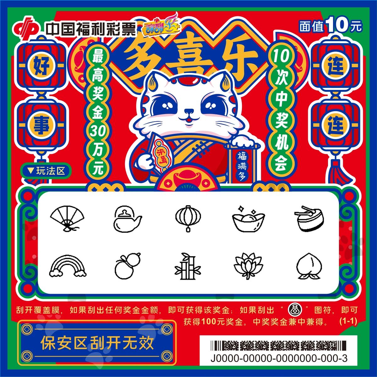 近日 寓意欢乐祥和 福运满盈 生活美满的刮刮乐新票 “多喜乐”隆重登场 票面介绍 刮刮乐新票“多喜乐”采用国潮风设计,以红色为主色调,搭配蓝色和黄色,色彩鲜艳,充满喜庆氛围。本次上市的新票有10元、20元两种面值。 多喜乐10元 (最高奖金:30万元) ![]() 多喜乐10元票面展示
