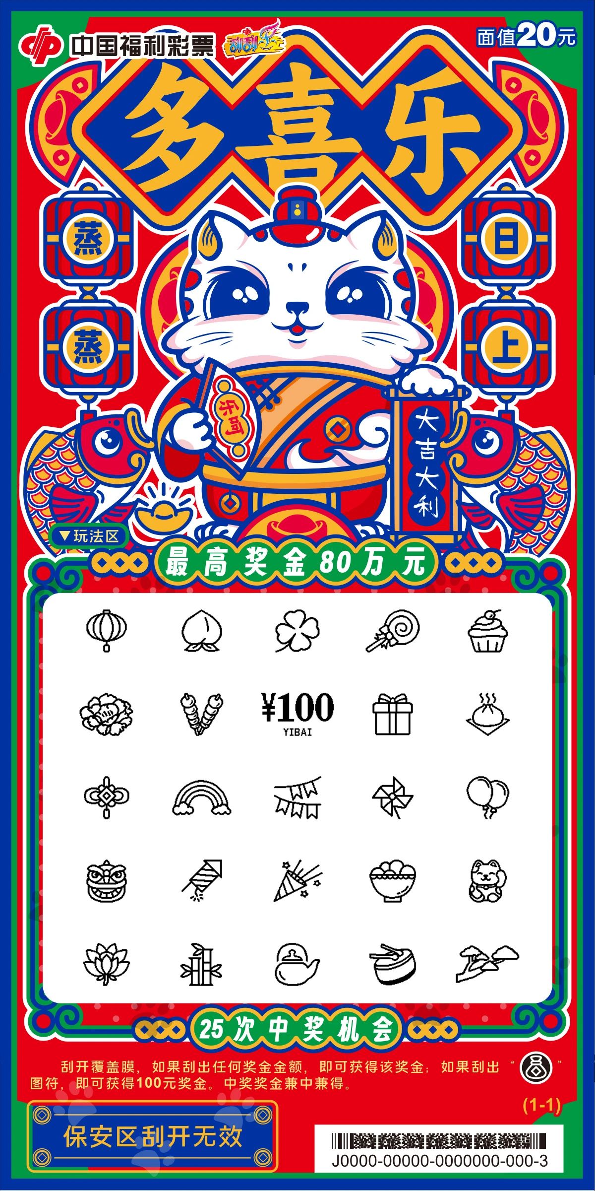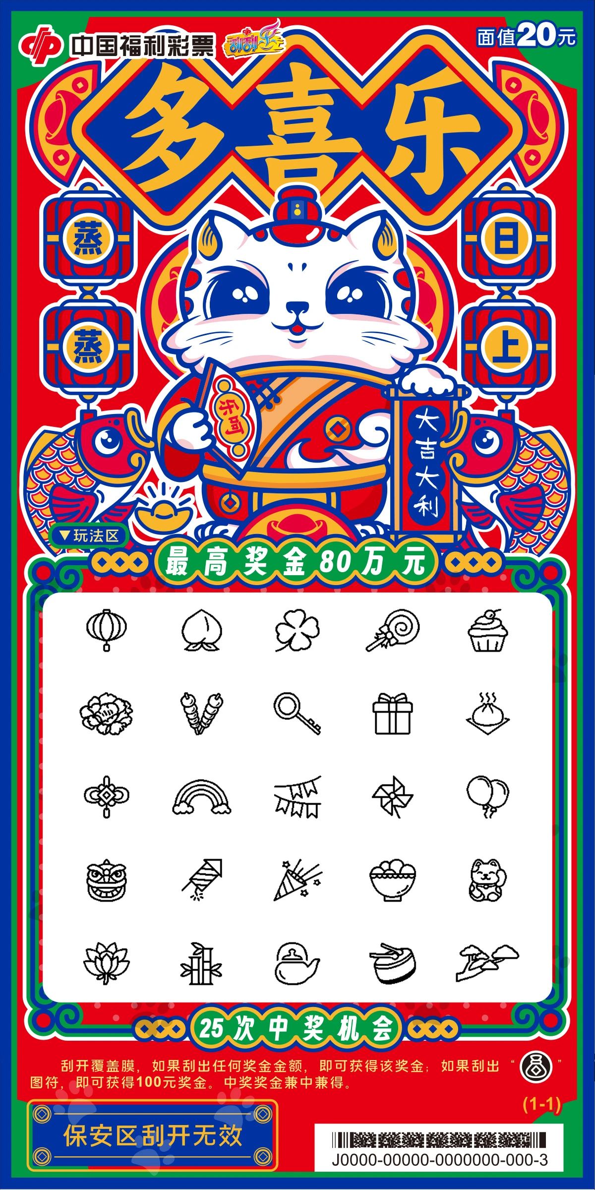 多喜乐20元 (最高奖金:80万元) ![]() 多喜乐20元票面展示