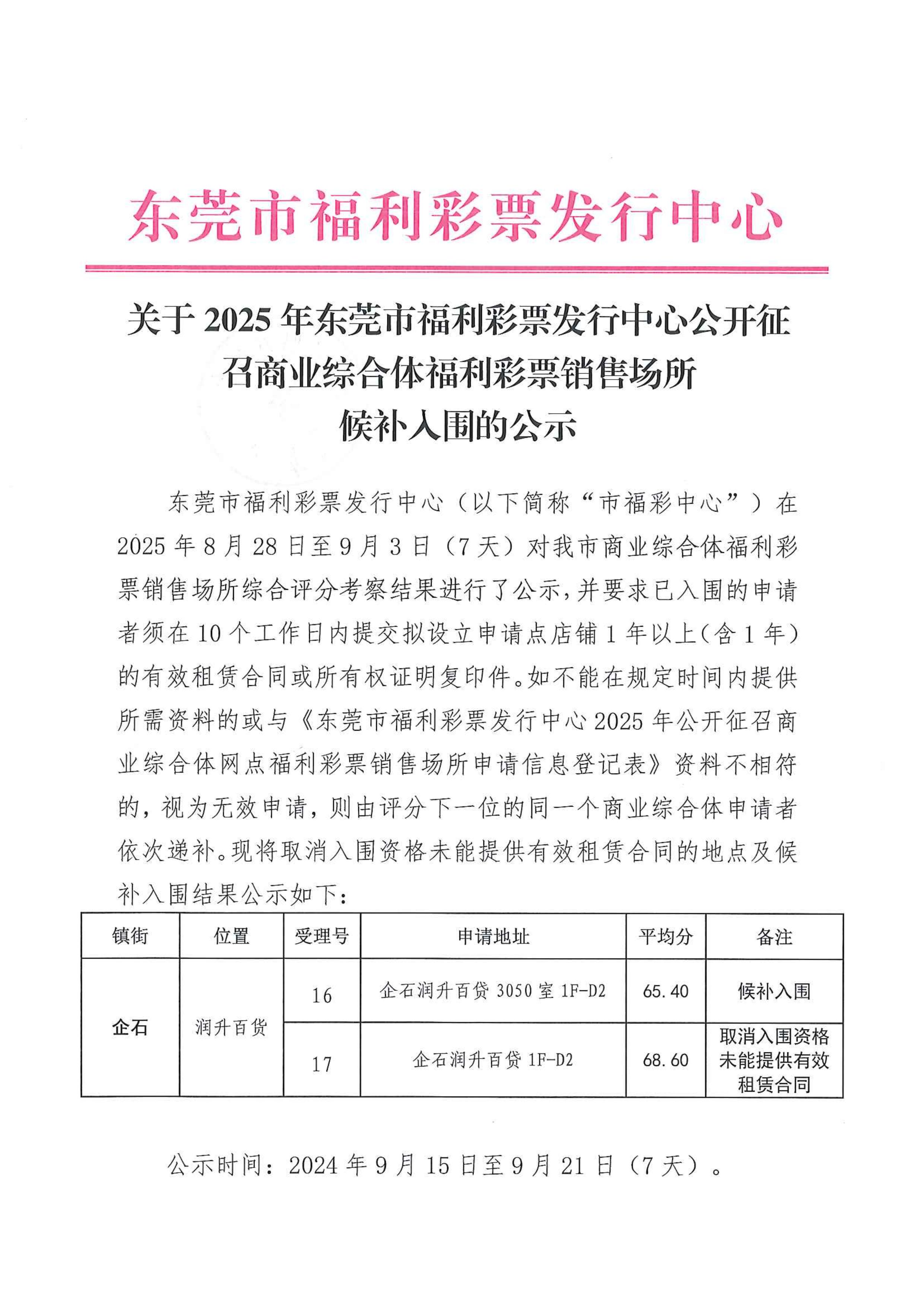 关于2025年东莞市福利彩票发行中心公开征召商业综合体福利彩票销售场所候补入围的公示