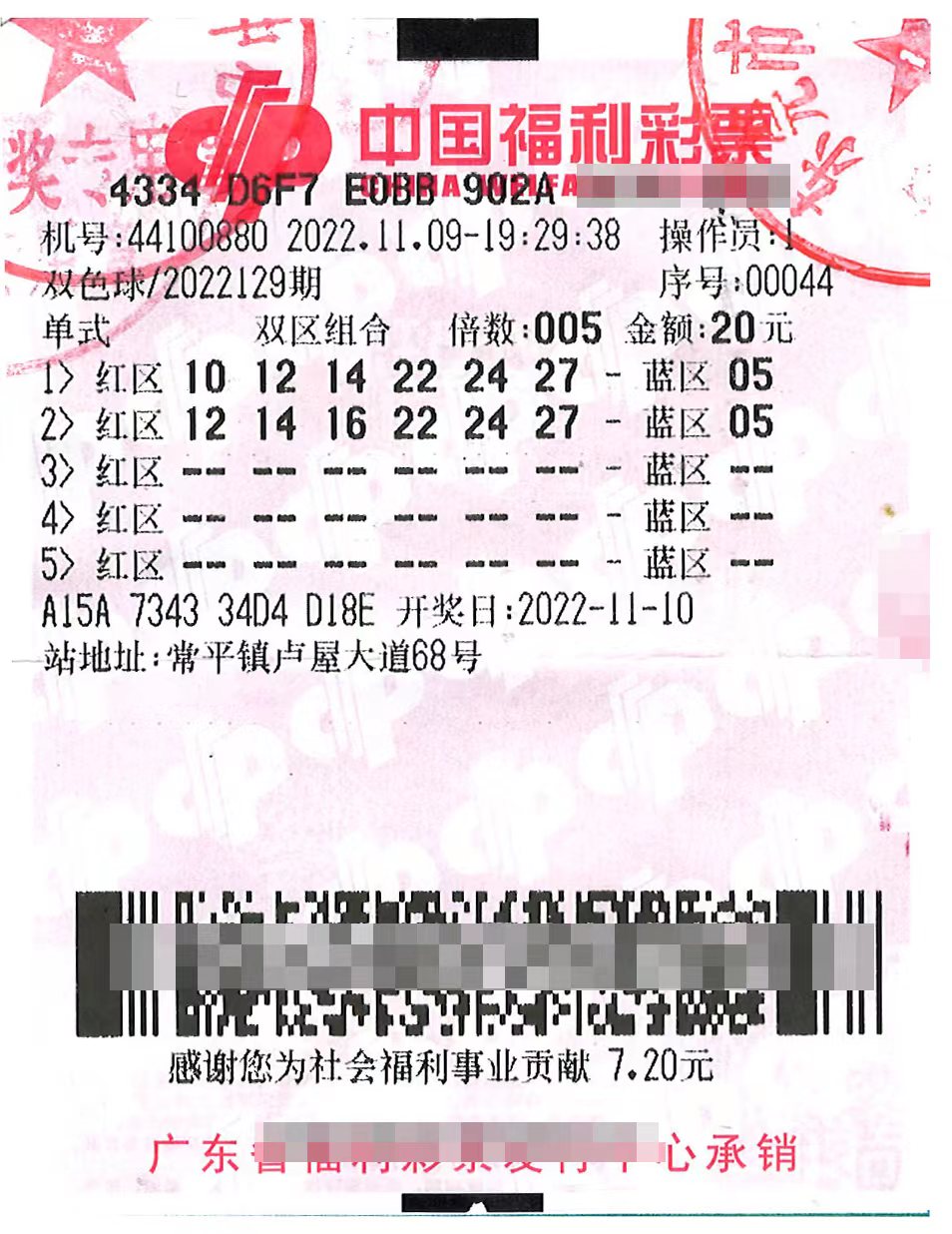 1110日福彩双色球第2022129期开奖红色球为10、12、14、22、24、27,蓝色球为07。当期全国共中出7注一等奖102注二等奖广东揽获其中16注二等奖单注奖金242633东莞常平镇的44100880销售网点凭借一张自选单式两注5倍票独中5注二等奖总奖金121万多元