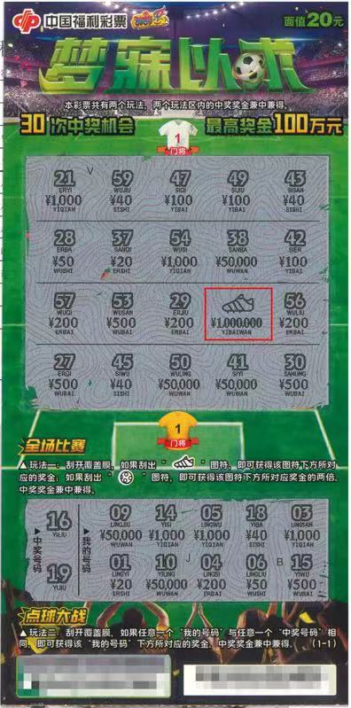 据了解梦寐以求”是中国福利彩票刮刮乐在去年年底新推出一款运动主题游戏票面设计极具沉浸感身临其境体验赛场氛围中央两个玩法分别设计对阵阵容和点球道具元素该彩票面值20共分11个奖级最高奖金100万元30次中奖机会奖金兼中兼得