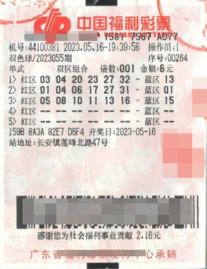 5月16日中国福彩双色球2023055期开奖,当期双色球开奖,红球号码为03、04、20、23、27、32,蓝球号码为13。当期双色球一等奖1注独中,单注奖金为 1000万元。这全国独一无二的大奖花落东莞市长安镇莲峰北路47号第44100381号销售网点,中奖彩票是一张6元单式机选票。